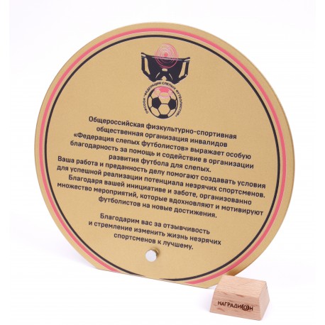 Приз-плакетка изготовлен из прочного металла в форме круга.