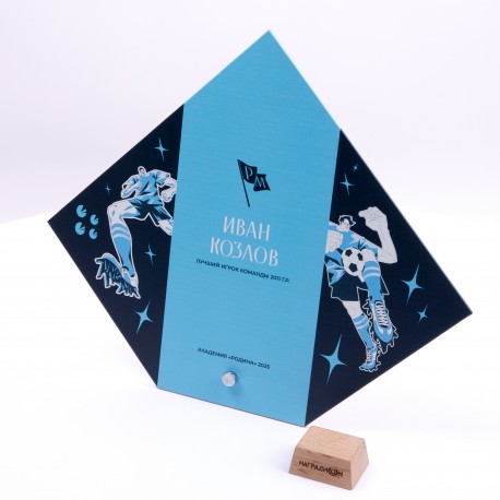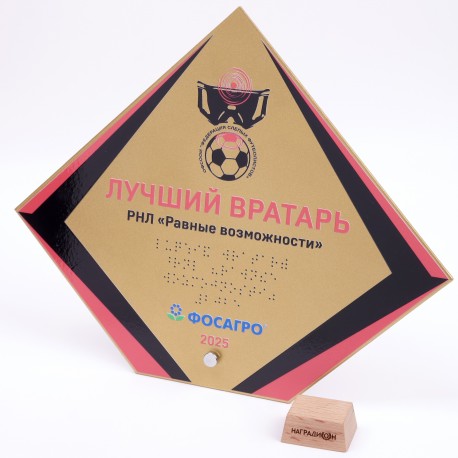 Приз-плакетка изготовлен из прочного металла в форме ромба.