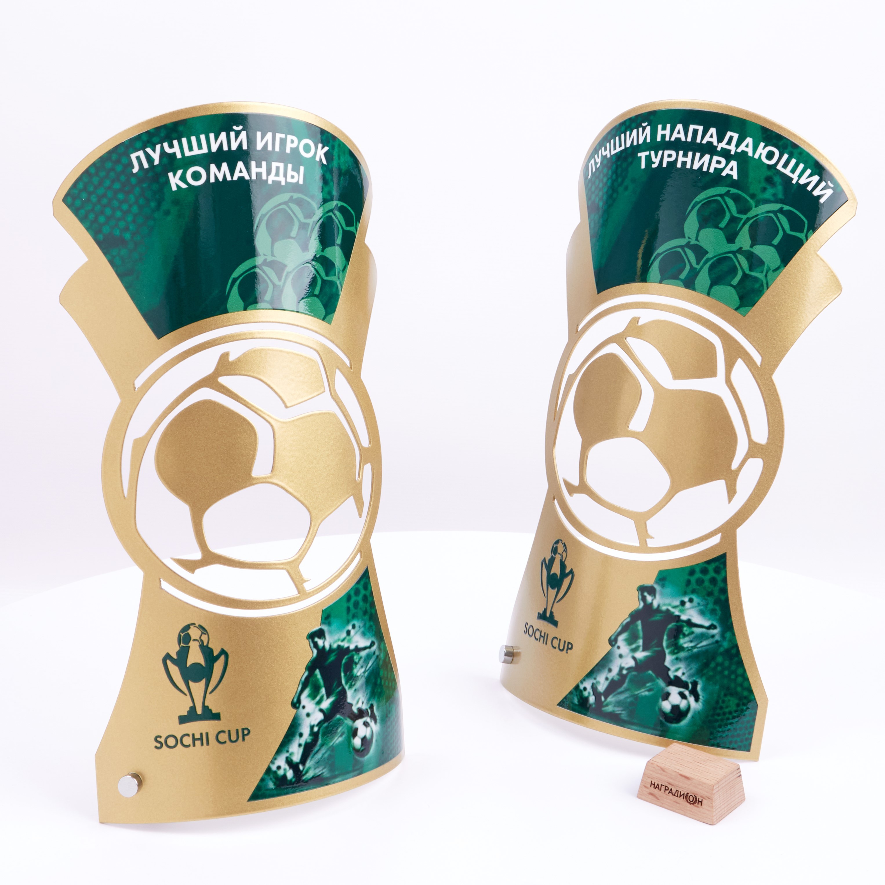 В центральной части изделия размещён вырезанный элемент, стилизованный под футбольный мяч.